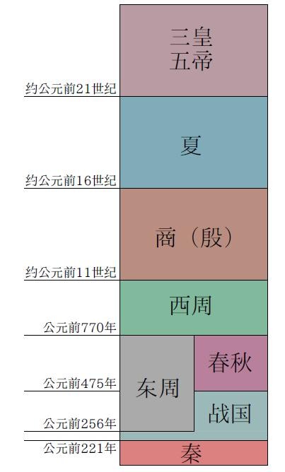 除去传说中的三皇五帝时代,从夏代开始算起,然后商灭夏,周灭商,一直到周被秦灭,历经约1800年的历史。