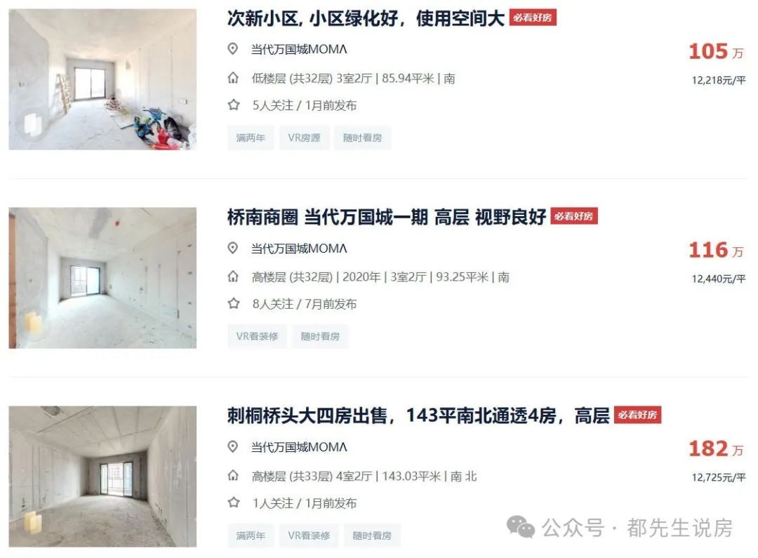 比如桥南板块这个当代万国城就很典型,当年限价一平一万多一点,很多人深知自己买得便宜成本很低,买到手便大大方方承认自己不住就是投资。这批从不装模作样的人现在卖房也挺干脆,眼看着同小区二手房堆积如山,他们也就心甘情愿接受亏损,想按原价把房子卖出去。