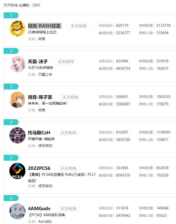 在端游绝地求生模块,排名第一的是微竞-RASH悲喜,第二第三分别是沫子和陈子豪,大家熟悉的GODV 排在第六位,这可能跟他直播时长有关系。