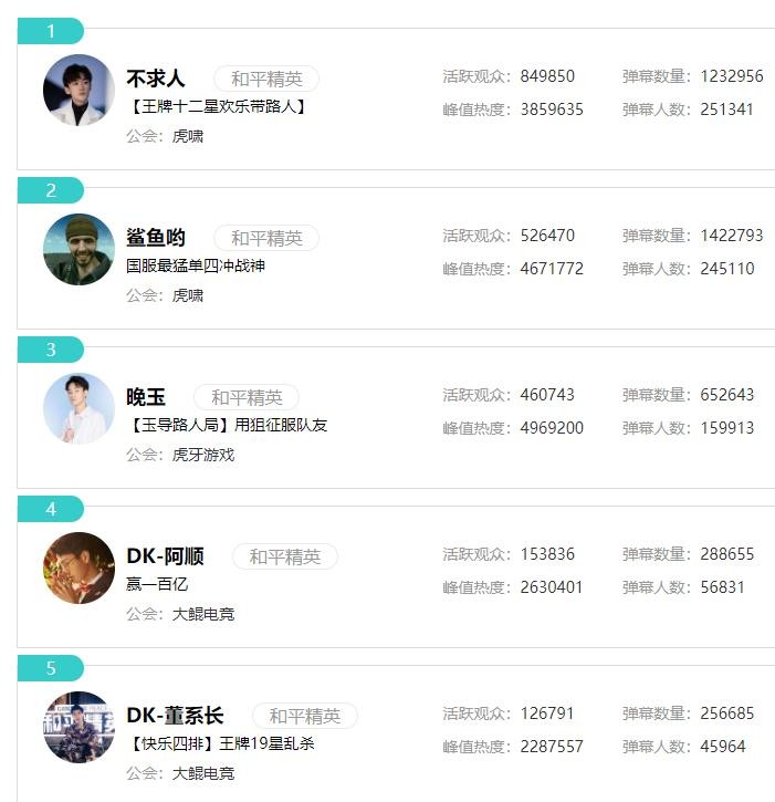 在和平精英板块,排名最高的毫无疑问就是 不求人,不求人不仅颜值超高,而且技术非常厉害,可谓男女老少通杀;排在第二和第三的分别是鲨鱼和晚玉。