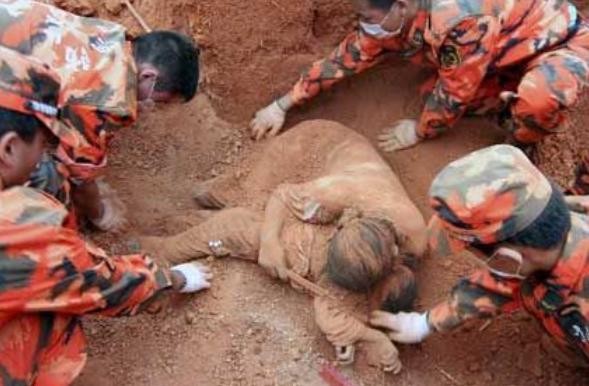 这个照片是一个开店的母亲,在地震来临的那一瞬间,用自己的身体为孩子挡住了坠落体,但是母子二人还是没能幸存,在搜救队员找到的时候,母亲紧紧的拥抱着孩子,搜救队员无论怎样都没能分开,最后也只能维持这个姿势下葬。