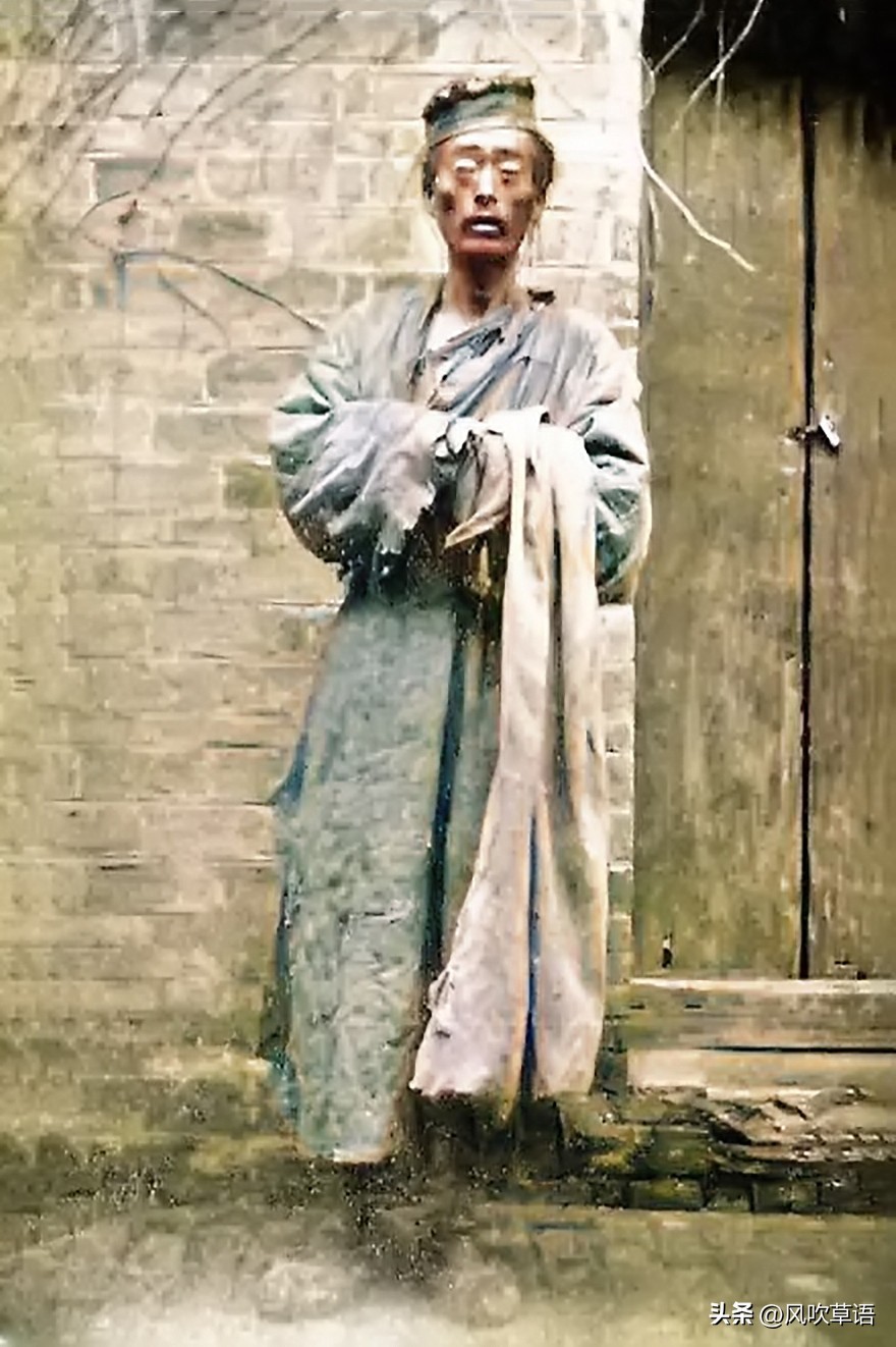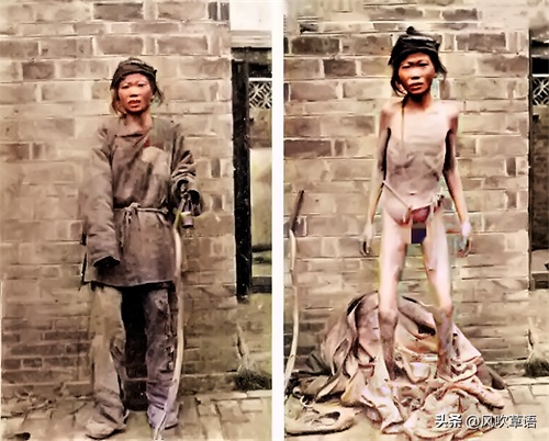 画面中这个眉清目秀的年轻人手里拄着一根拐杖,原以为他的身体有残疾,当脱掉衣服之后,瘦弱的身体便赫然暴露在人们面前。正值青春年少的他因为饥饿变得有气无力,以至于不得不依靠拐杖站立。