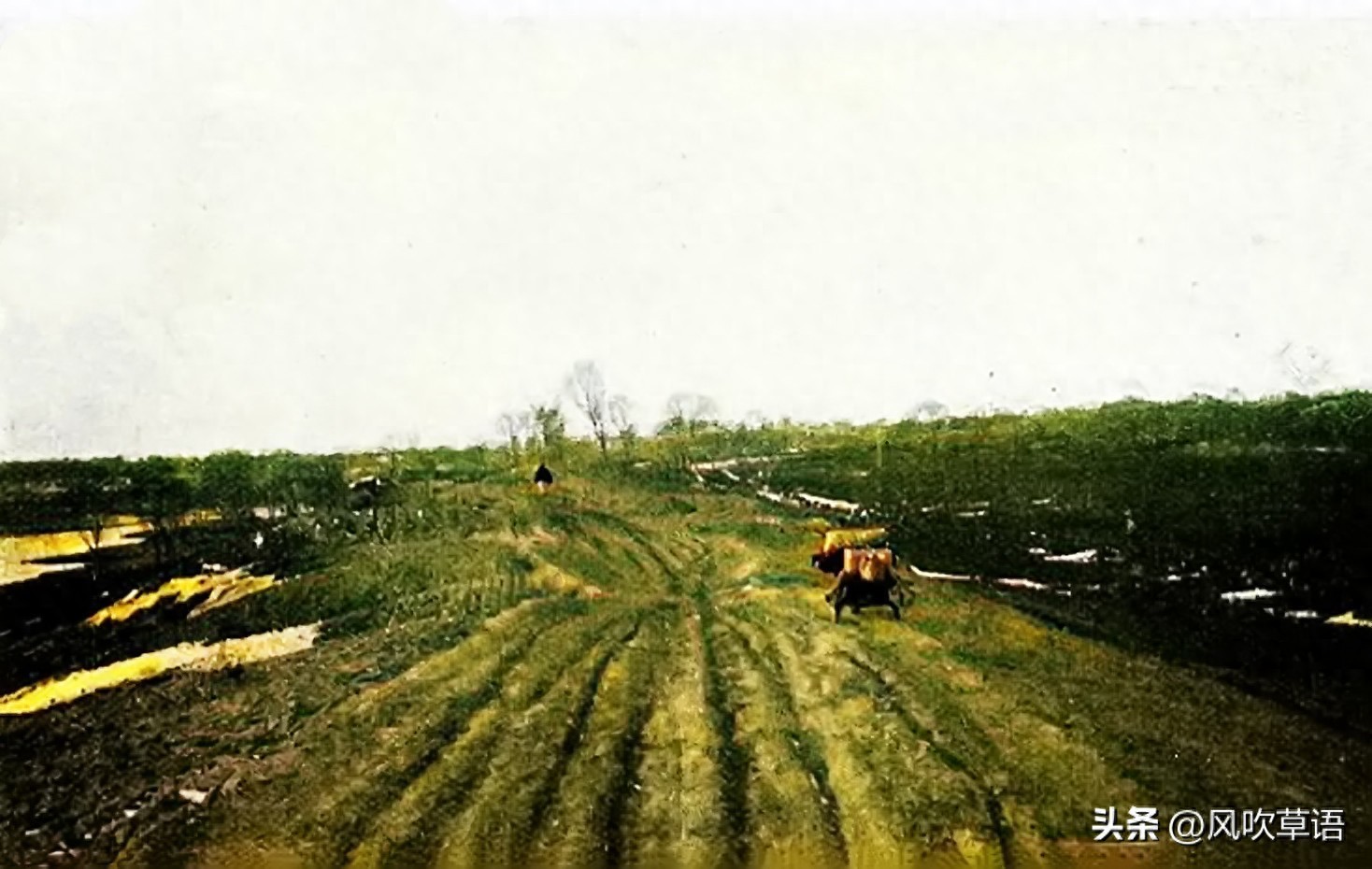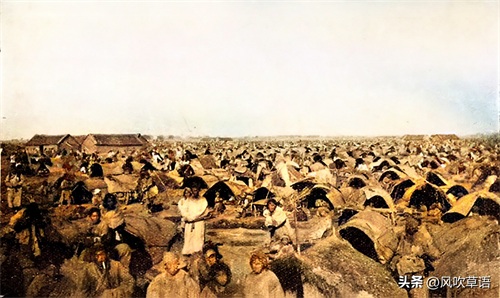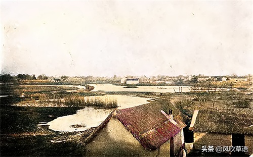 南通是灾民的目的地之一,这是从南通城墙向城外眺望看到的景象,近景是两座茅草小屋,屋子的附近是有不少的小池塘,草丰水美,的确是一片富庶之地。