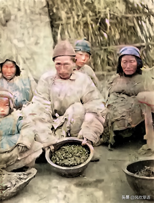 一名村民正在向拍摄者展示他们平日所吃的东西,是由谷糠、麸子和草根混杂在一起的食物,让人难以下咽,然而对于饥民来说,又是无比珍贵的救命之物。