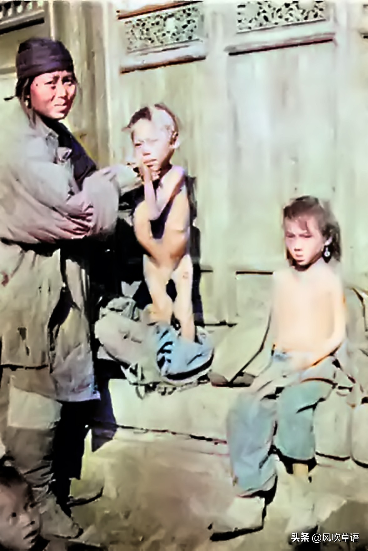 一位母亲带着两个孩子坐在寺庙门前的石台阶上晒太阳,她的一双儿女都患有佝偻病,女儿的病情比较轻,儿子的病却很厉害,已经严重影响了身体发育。在饥饿和疾病的双重摧残下,这个孩子不知还能坚持多久。