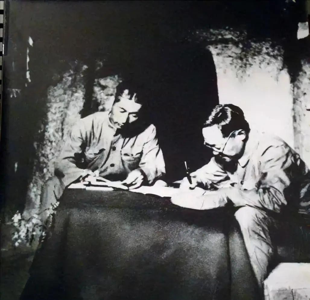 巴金(右)在朝鲜战场进行釆访