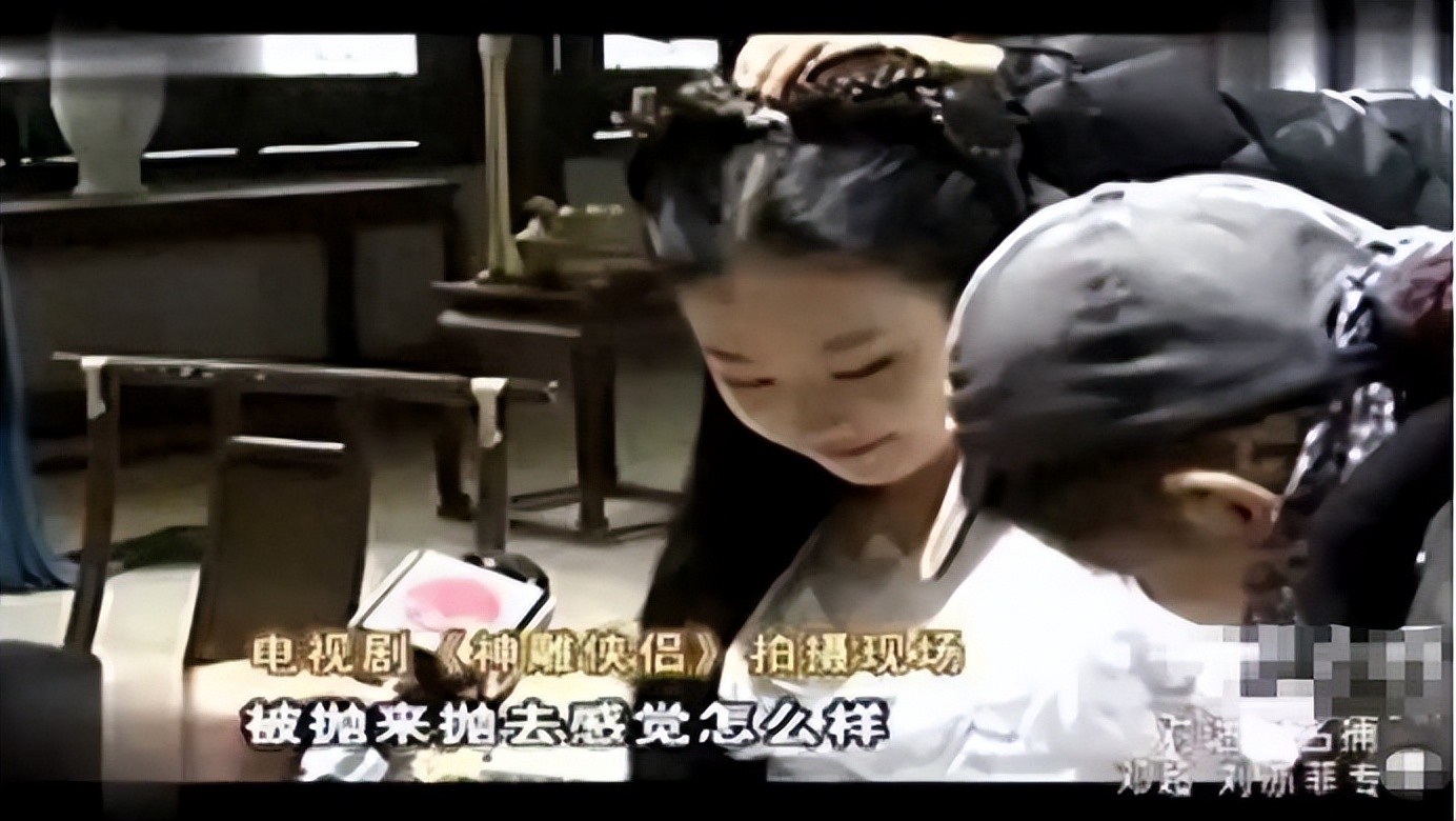 当时,她正在拍摄经典电视剧《神雕侠侣》,其中的一场戏,是她替丐帮兄弟击退了邪恶的金轮国师。这场戏拍摄了一个小时,她被群演们抛举庆祝,却也因此发型凌乱,衣衫不整。