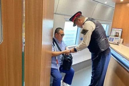 当日清晨,列车停靠苍南站时,孙浩车长发现一名盲人旅客独自手持导盲棍在站台小心翼翼地行走。他立即上前搀扶并询问情况,得知该旅客全盲且独自出行后,孙浩车长暖心安慰道:“您不要着急,行李我帮您拿,我现在扶您去座位上!”随后,孙浩车长将旅客安顿好,并告知其不要担心,列车工作人员随时在身边服务,有需要随时交流,下车时会提前帮忙拿行李、协助下车,并联系下车站上海虹桥站做好出站接应准备工作。盲人旅客对孙浩车长的帮助连连称赞,周围旅客也纷纷为其周到服务竖起大拇指。
