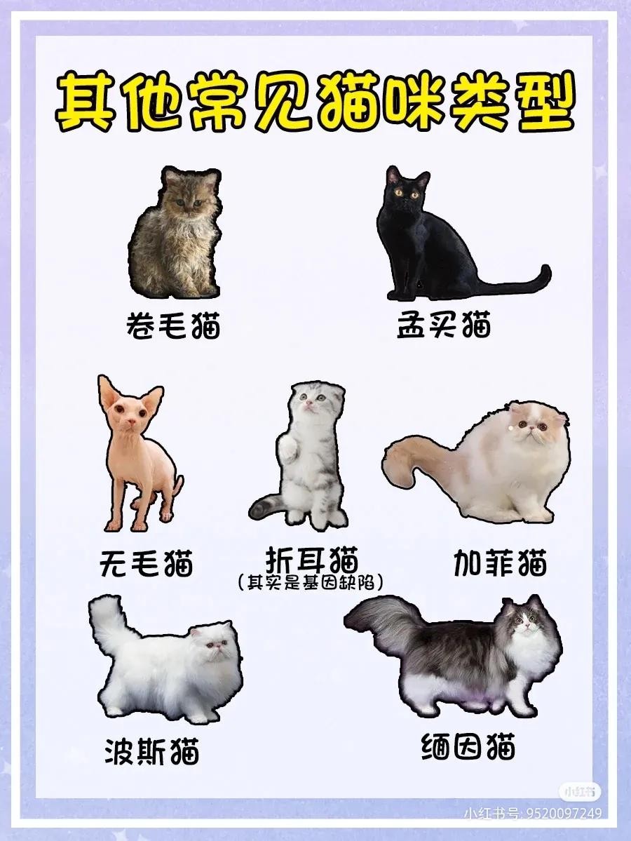 卷毛猫、孟买猫、无毛猫、折耳猫(基因缺陷)、加菲猫、波斯猫、缅因猫