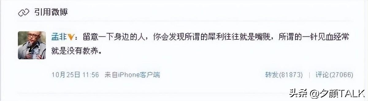 就连乐嘉的搭档孟非,多期节目进行圆场之后,也忍不下去了,在微博上直言:多留意身边的人,你会发现犀利就是嘴贱,所谓的一针见血就是没有教养。