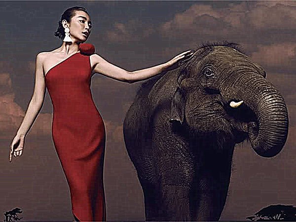 李冰冰是中国著名的演员,李冰冰登上《男人装》封面,演绎“冰的凝视”与大象合作拍摄了一组另类大片,与大象一同出镜呼吁大家爱护动物,也非常好的承担了联合国环境规划署亲信大使的责任。