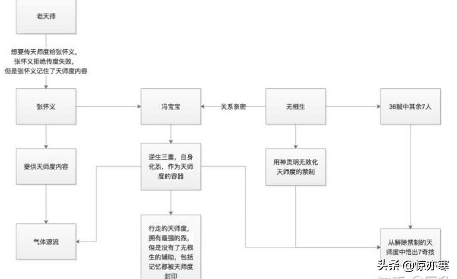 为了窥探修仙之道,张怀义和无根生联合36贼破解天师度符文。结论就是:将符文刻在一个人身上,ta整个人气化作为天师度的容器,或者说化身为一个人形天师度。