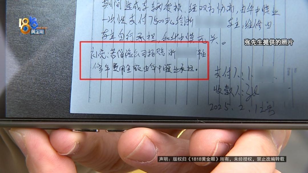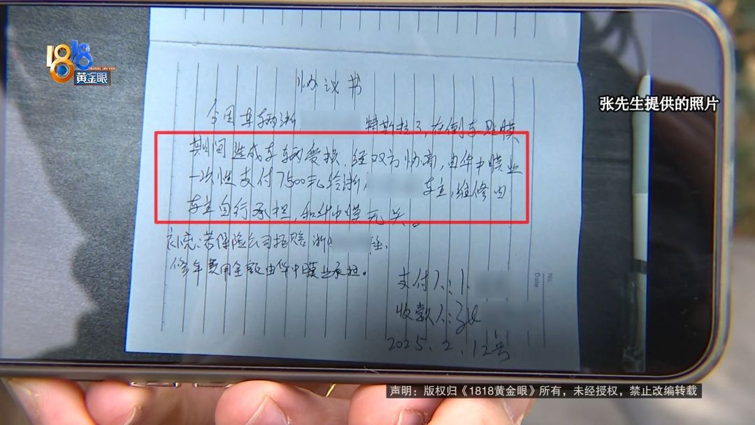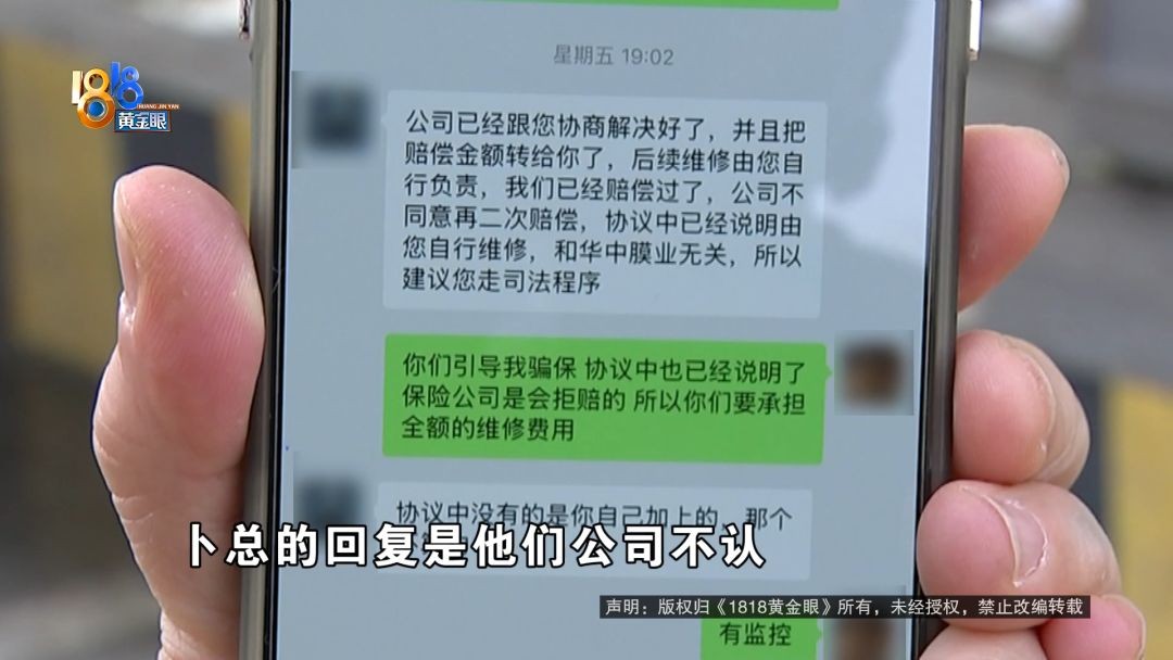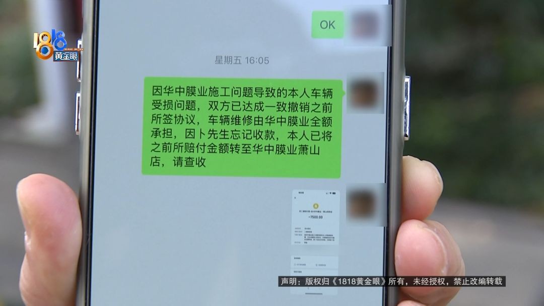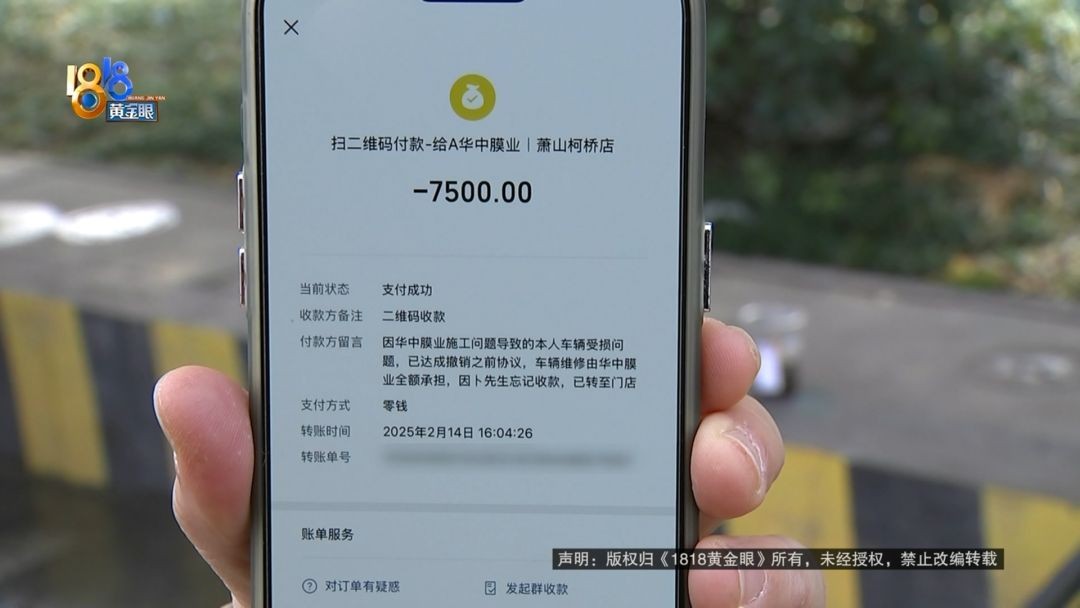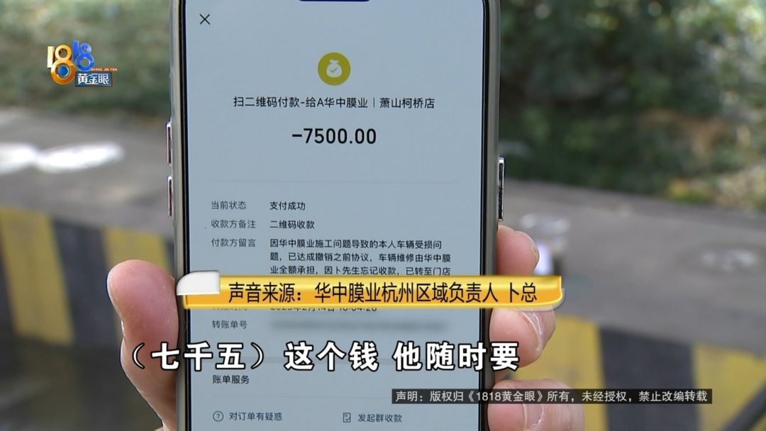 华中膜业杭州区域负责人 卜总:本来这个钱一次性付清,也不管赔偿多少钱,我们店里省得麻烦。第二天他又说不想要这个钱,想去修。公司考虑还是以顾客为主,多个三千两千都无所谓了,一定损,两万多。我就上报公司,公司说太多了,接受不了。(七千五)这个钱,他随时要都可以给他。因为他扫码转过来,公司怎么给他?公司也没有他的账号 。