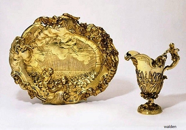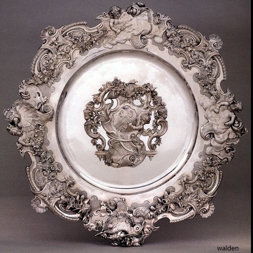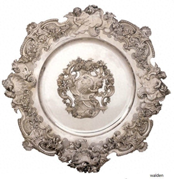 1736/1737年,梅纳德家族(Maynard family)委托制作大型展示盘。这可是真正意义上的炫富。这盘标志是保罗·德·拉梅里(Paul de Lamerie)在金匠公司注册标志,盘的中央是梅纳德(Maynard)家族的徽章。