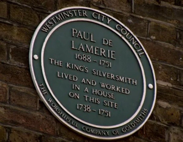 英国银器学术界不少专家都认同在“十八世纪英国最伟大的金匠”保罗·德·拉梅里(Paul de Lamerie)背后还存在一个不知名且未注册的工匠。维多利亚和阿尔伯特博物馆(Victoria and Albert Museum)将保罗·德·拉梅里(Paul de Lamerie)描述为“ 18世纪英国最伟大的银匠”。令人仰望,神一样的人物!有个问题一直困扰着我,这么牛掰的大神,为何未能获得皇家金匠(Royal Goldsmiths)称号,不知道读者有没有注意到,故居墙上的铭牌是虔诚金匠公司(Worshipful Company of Goldsmiths)制作的,称他为国王的银匠(The king's silversmith),差不多的意思,但真实情况相去甚远。皇室册封皇家金匠(Royal Goldsmiths)称号意义不同,有法律保障,是皇家对工匠的最高肯定,是皇室采购的供货商。