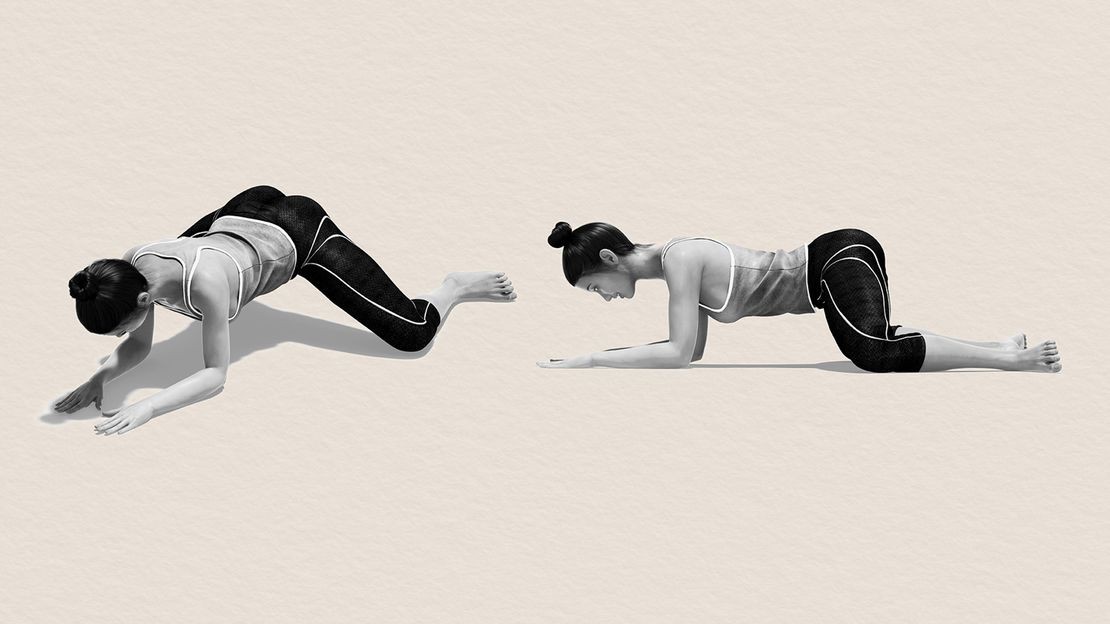 桌面式准备,双手和膝盖在地面上支撑体重(保持背部与地面平行)慢慢地将膝盖滑开,将体重向前移到你的手上,保持膝盖弯曲,同时将双脚慢慢拉向两侧,这样它们就在膝盖的正后方并旋转双脚,你的体重就会落在内足弓上弯曲肘部,将胸部降低到地面,同时使尾骨指向背部。臀部与膝盖保持在同一平面上。