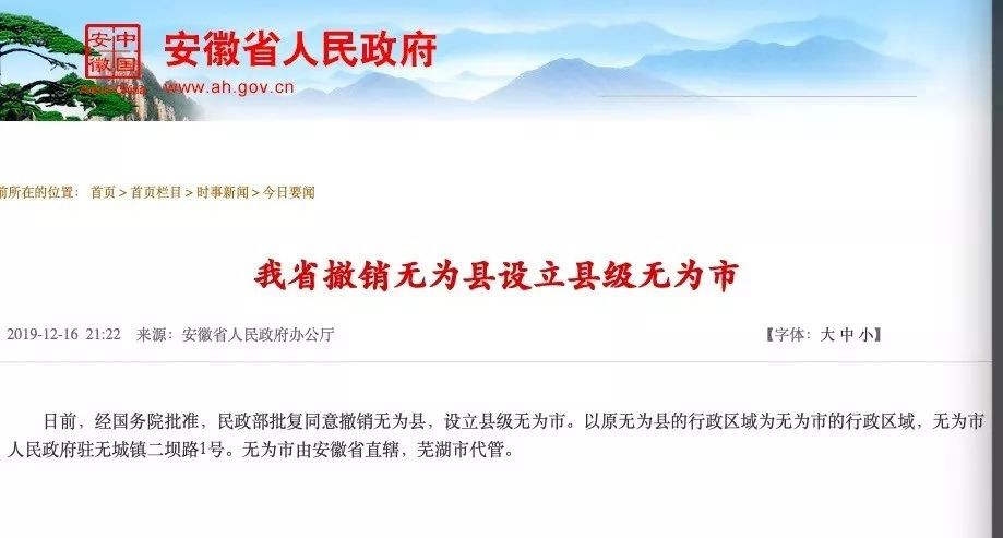 日前,经国务院批准,民政部批复同意撤销无为县,设立县级无为市。以原无为县的行政区域为无为市的行政区域,无为市人民政府驻无城镇二坝路1号。无为市由安徽省直辖,芜湖市代管。