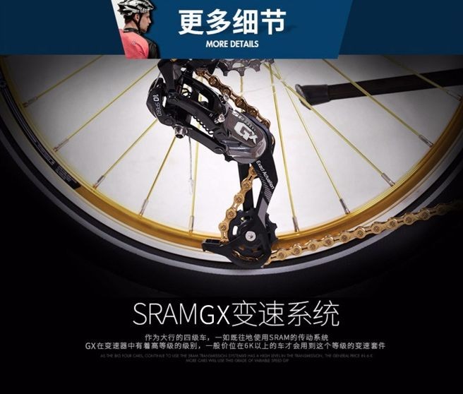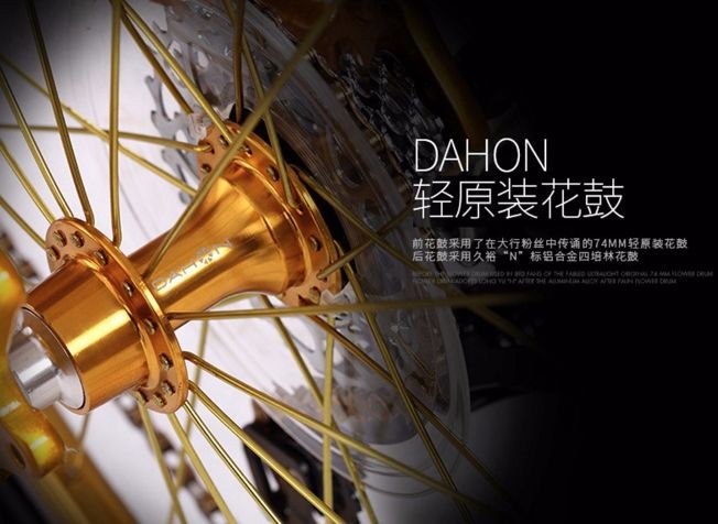 不过话说回来,你可千万不要小瞧这款土豪色折叠车,该车搭载变速套件中最高等级的级别SRAMGX 20速变速系统,前后花鼓采用大行阳极色超轻量花鼓,轻缕空齿片,快速挂链上档,一体式牙盘让传动效果直线上升,上路时,别提多快了!