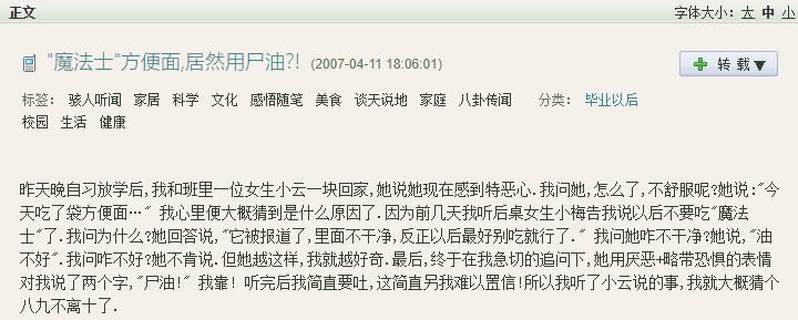 2007年3月,魔法士方便面就传出了说是有火葬场尸油制作的谣言。