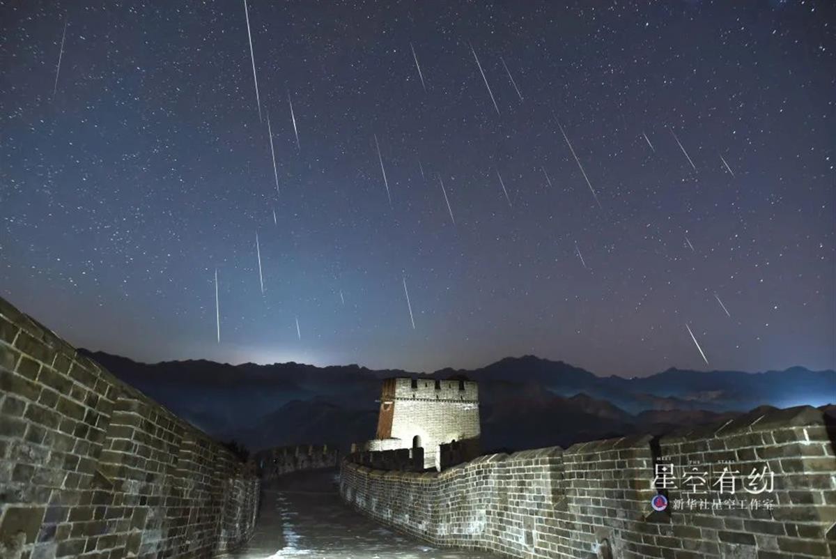 中国天文学会会员、天津市天文学会理事杨婧2021年12月14日在天津市蓟州区黄崖关长城拍摄的双子座流星雨(多张叠加)