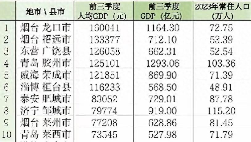 在衡量一个地区经济发展水平时,人均GDP无疑是一个极具参考价值的指标。它不仅反映了该地区经济的整体实力,更体现了民众的生活水平和幸福感。近日,根据2024年前三季度的最新数据,山东人均GDP前十的县(市)名单出炉,它们分别是龙口、招远、广饶、胶州、荣成、桓台、肥城、邹城、莱州和莱西。这些县(市)以其卓越的经济表现和人均收入水平,成为了山东省乃至全国的经济发展亮点。