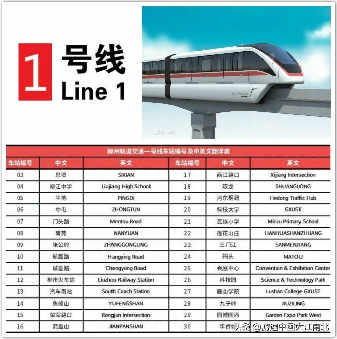 轨道交通1号线,线路标识色:红色,柳州市启动建设的第一条轨道交通,由柳江区上板桥站至柳东新区尚琴站,总线路全长约45.6km,其中高架线约40.1km,地下线约5.5km,共设35座车站,其中换乘站7座,高架站30座,地下站5座;全线设一段两场,分别为帽合车辆段(综合基地)、三门江停车场、尚琴停车场;工程总投资约126亿元。经过反复对比论证,柳州轨道交通1号线制式最终确定为跨座式单轨。