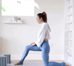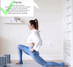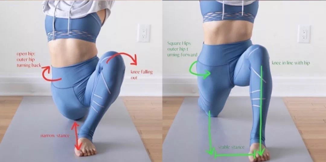 给大家分享4张关于瑜伽新月式中骨盆的图片。三张是调整骨盆正位的动图和一张正误对比图。
