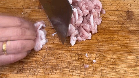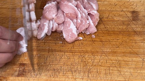 6. 猪瘦肉一块先切成薄片,接着改刀切成肉丝