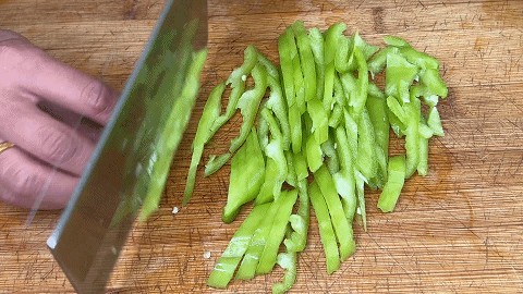 2. 青椒洗净去蒂去籽斜刀切成青椒丝,切好放入盘中备用