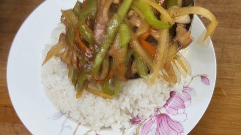17. 将米饭盛入盘中,舀一勺青椒土豆肉丝盖在表面,美味即享