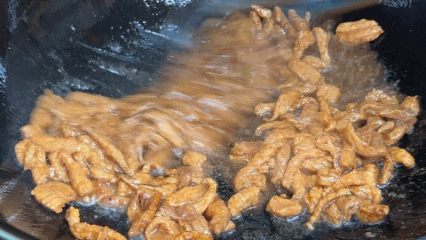 10. 起锅加入植物油,油热将肉丝下锅滑炒
