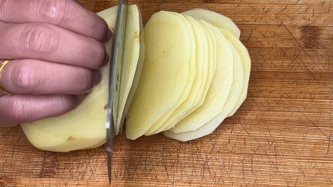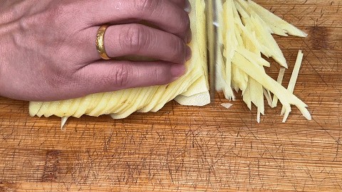 4. 土豆削去外皮,先切成薄片,接着改刀切成土豆丝