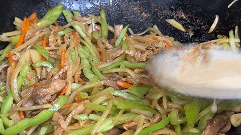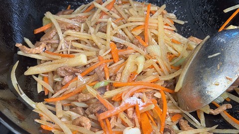 13. 大火翻炒均匀,加入土豆丝翻炒