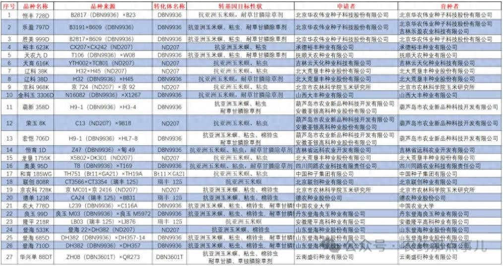 本次审定名单所涉信息最早见于今年3月19日发布的初审公示,包含27个转基因玉米品种和3个转基因大豆品种,本次正式公告代表着初审通过的30个品种全部获得正式通过,随后即可拿到种子审定证书。