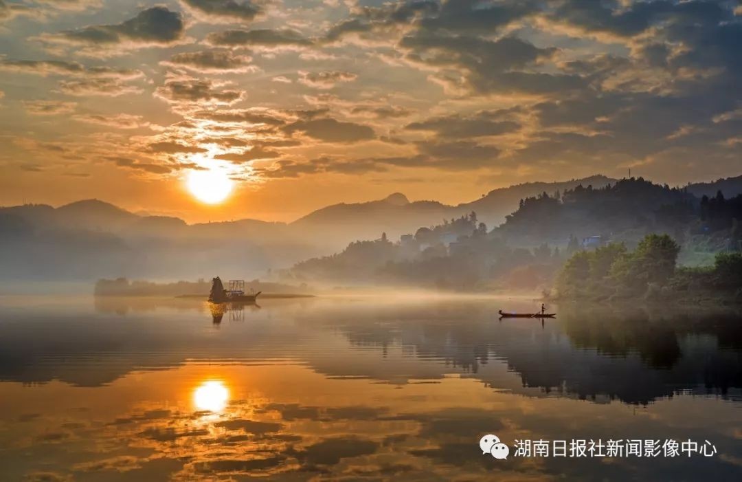 红日跃出山峦,酉水像是一面明镜