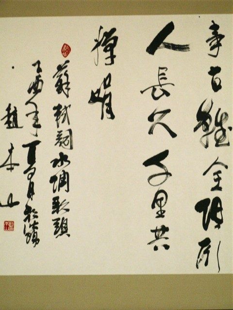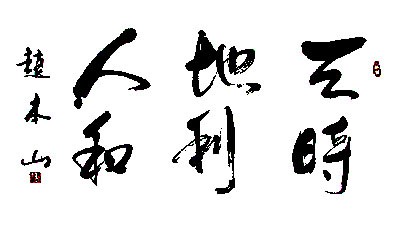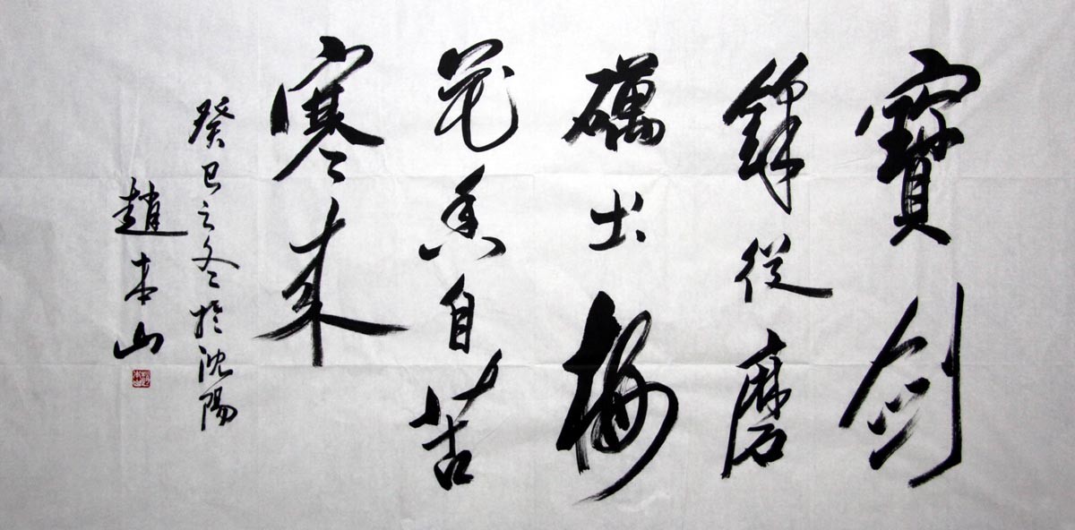 看赵本山的字,整体上颇有气势,字迹连贯,一气呵成;章法上既有唐代张旭怀素书法的张狂不羁,讲求笔势和用笔的节奏感,但同时又有所收敛,每一笔又在追求严谨的字形,在撇那的转折处又有宋代米芾的气韵,强筋的飞白,险中求稳的笔意,每一笔都蕴含了自己对人生岁月的感慨与执着的信念;赵本山的印款很有意思,不是传统的自右到左自上而下的排列,而是和传统相逆的。