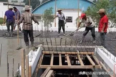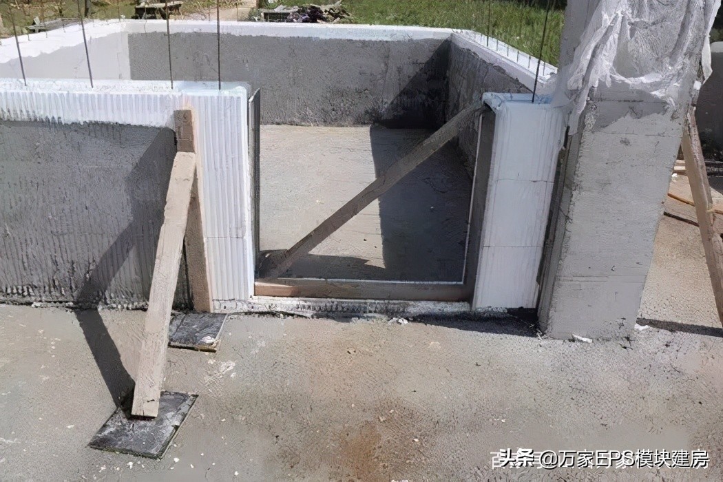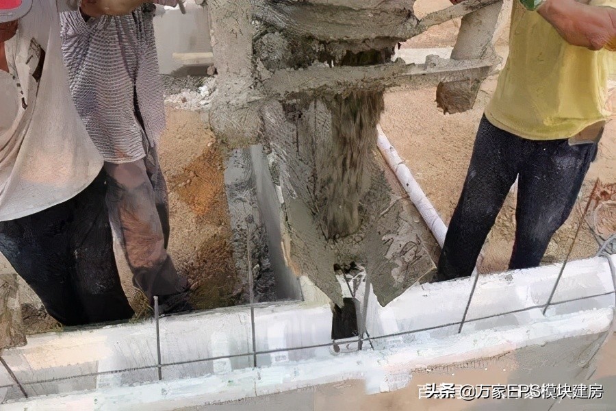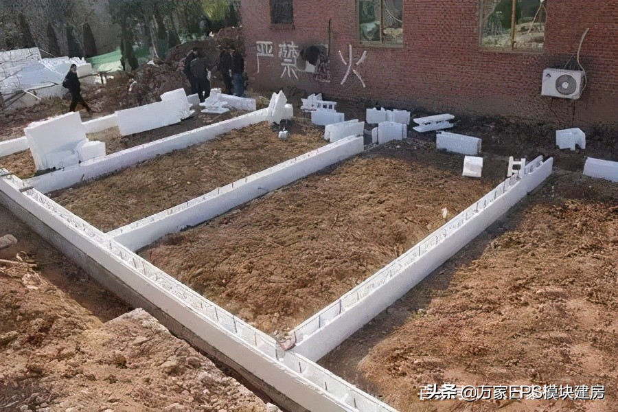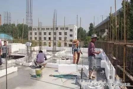 基础完成后,就开始安装模块浇筑钢筋混凝土了。沿基础安装EPS模板,其自带的企口能够让相邻的模块做到无缝连接,避免混凝土跑浆。