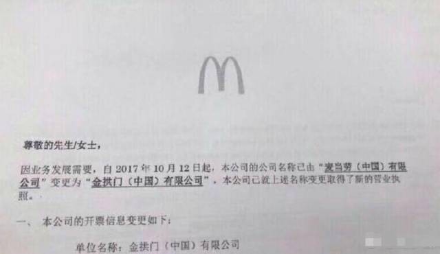 其实早在10月12日,麦当劳就进行了更名行动。而且金拱门这个名称早在1993年就进行了注册。其主营则是麦当劳产品,技术进出口等相关业务,也就是说,麦当劳提卖给顾客的汉堡材料很多是金拱门提供的。