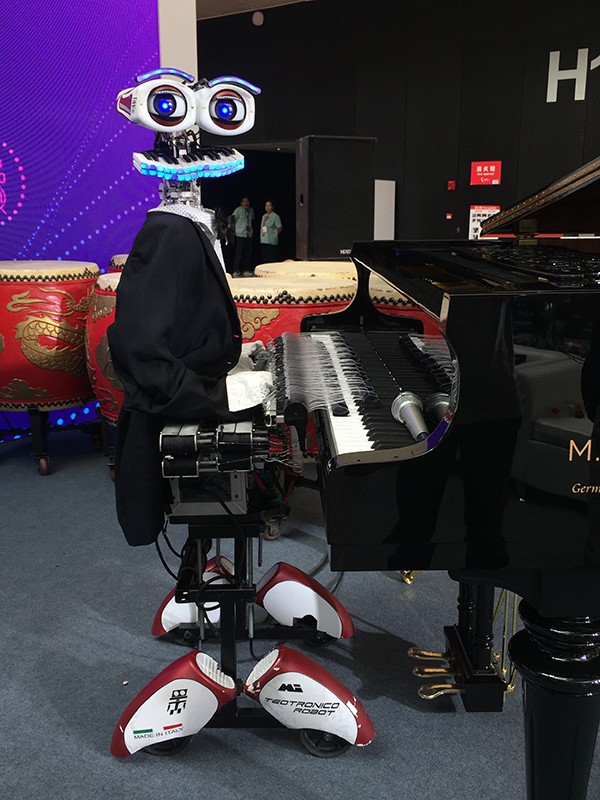 一束灯光打在舞台中央,来自意大利的机器人特奥身穿黑色燕尾服,打着黑色领结,脚上穿着“红运动鞋”,坐在钢琴边自弹自唱,一曲未了,技惊四座……