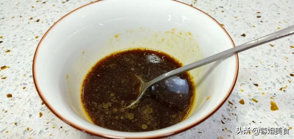 4、准备一个小碗,小碗中加入生抽两勺,老抽一勺,蚝油半勺,盐一勺,鸡精半勺,最后再加入少许香油搅拌均匀,就能得到一小碗料汁。炒肉丝时所加入的调味品,采用料汁将其搅拌融化,能让肉丝更好入味。