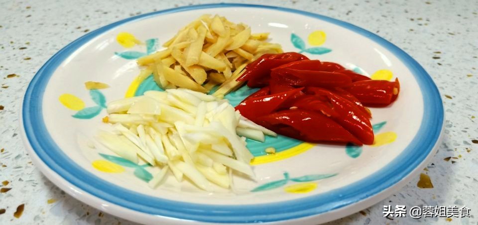 3、准备两个泡椒,把泡椒切成丝状装碟备用,再准备一块泡姜,将泡姜切丝备用,最后还要准备适量蒜末备用。四川人在炒肉丝的时候,泡姜,泡辣椒以及大蒜,都是要必须准备的三件套,这样炒出来的肉丝,才好吃。