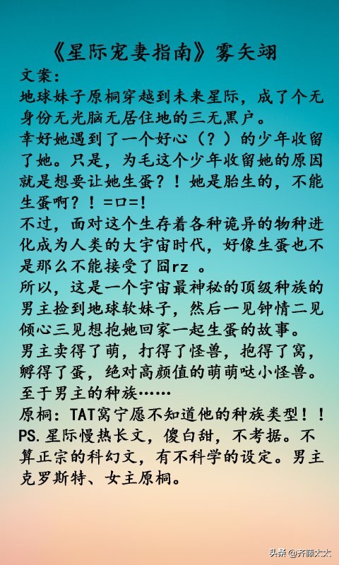 最近好多小可爱跟太太推荐腿哥的指挥官,我还没去看,但是感觉是本很上头的文呀~刚好记起我还没有推过星际文的专题,然后就跟你们总结了十二本看过的或者是感觉不会坑的星际宠(爽)文!