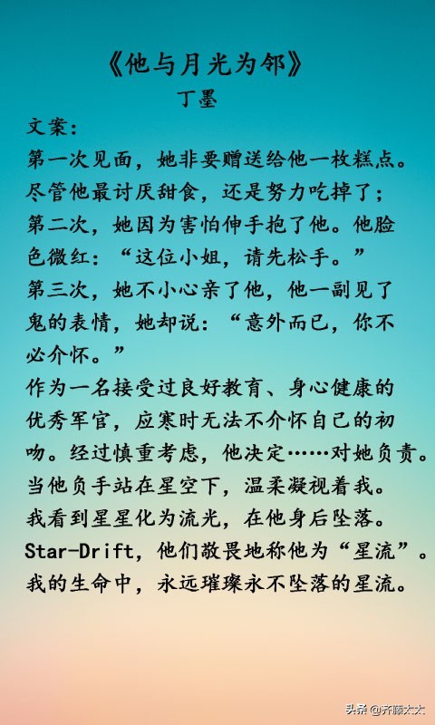 丁墨的文我应该也基本上很久之前就都看完了,近两年的新文还没看,这两本都算是星际文吧,月光那本就是男主是未来的,但是情节基本上还是在现代。