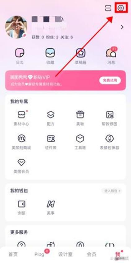 1、点击美图秀秀界面右下角【我】,然后点击右上角的【设置】按钮。