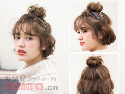 短发怎么扎好看呢?要投资巧克力色系的短发烫发发型,简单的设计成半扎发的丸子头发型,搭配薄刘海下的白皙脸蛋,清新灵动更俏丽。