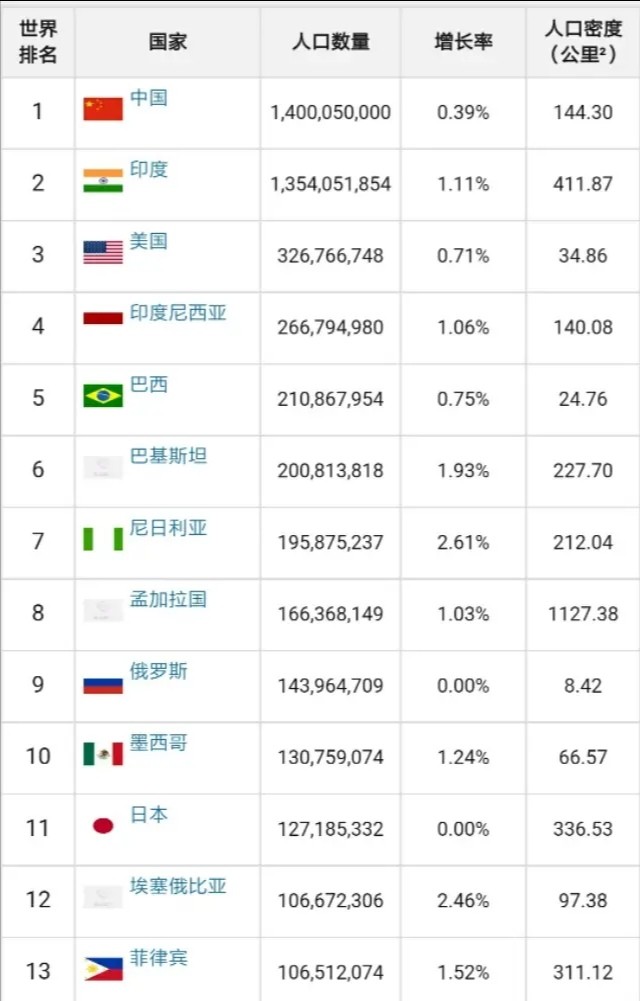 截止2020年04月07日,全球230个国家人口总数为7585204179人,其中中国以1400050000人位居第一,成为世界上人口最多的国家,印度以1354051854人位居地球第二,第三至第十名分别是:美国、印度尼西亚、巴西、巴基斯坦、尼日利亚、孟加拉国、俄罗斯、墨西哥。