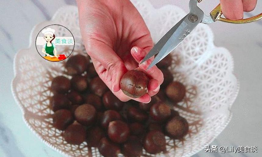 2、取一颗板栗,用剪刀在板栗中间划开一个口子,划到板栗果肉位置的深度即可。这个步骤也可以用瓶盖将板栗固定住,用菜刀来砍也是可以的,剪刀剪感觉更快一些。