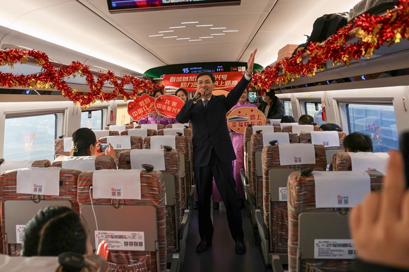 这趟由长春开往北京朝阳的G912次列车由沈阳局集团有限公司长春客运段动车二队担当乘务工作。为庆祝吉林省首趟智能复兴号开行,车队组织职工文艺骨干编排了多个精彩的文艺节目。一支《时代感》韵律操拉开了演出的序幕,独唱《上春山》引来旅客的阵阵掌声,歌伴舞《奢香夫人》将现场气氛推向高潮,旅客们纷纷拿出手机记录下精彩瞬间。