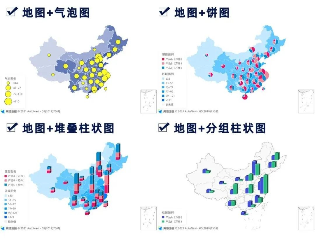 如果想同时展示地域相关的多个维度的数据,还可以使用地图与其他图表组合的【复合地图】。
