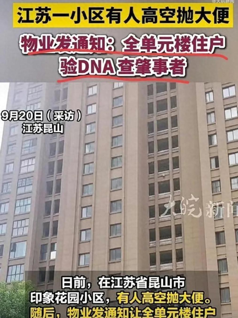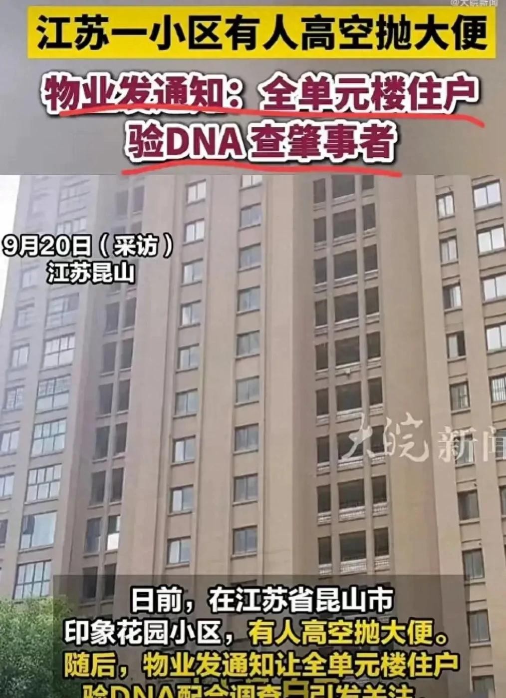 俗话说,祸从天降。但谁能想到,这“祸”竟是一坨粪便?近日,江苏昆山印象花园小区发生的一起高空抛物事件,让人哭笑不得,更让人深思。